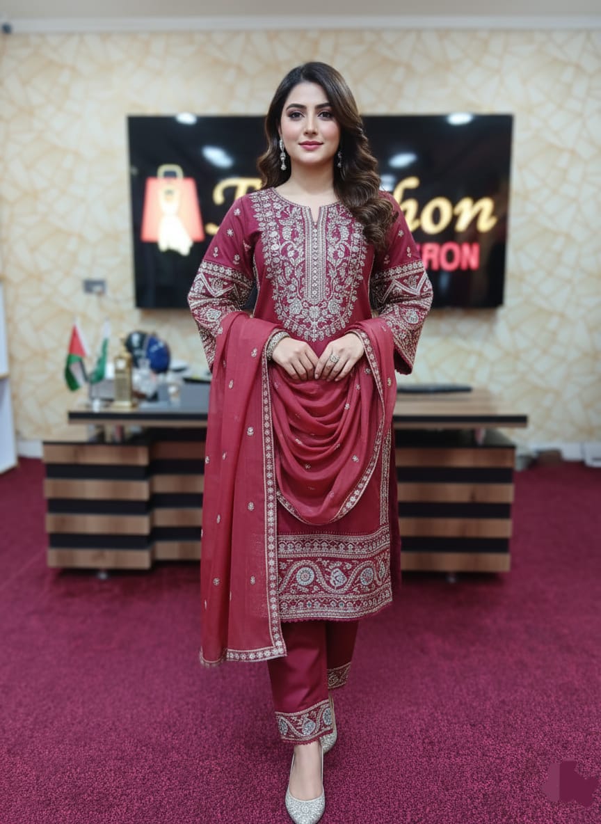 A Beautiful Maroon Embroidered Suit Showcasing Grace, Style, and Timeless Traditional Charm